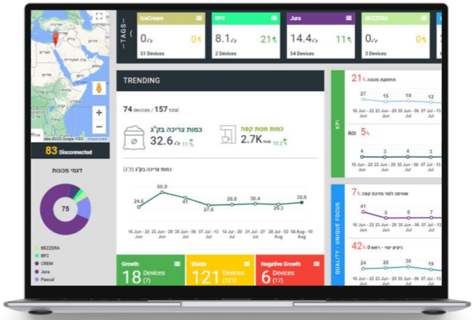 אפשר לנהל לא רק מכונה אחת, אלא כמה מכונות שתרצו מכמה בתי קפה שתרצו, כל עוד במכונה יש צ’יפ ומחוברת לרשת – תקבלו את כל המידע מכל מכונה בזמן אמת, בקלות ובבהירות מלאה